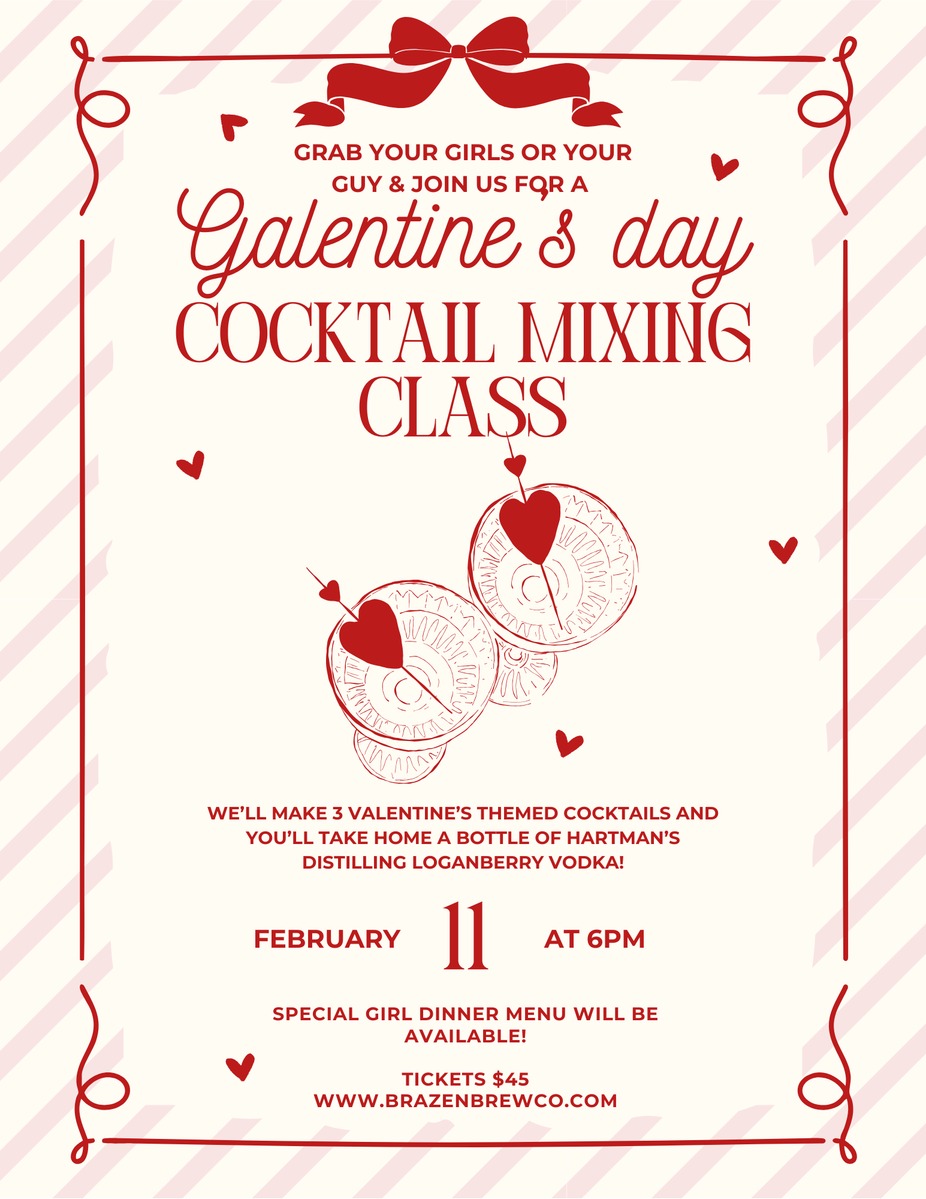 Join us for a special cocktail mixing class on Brazen's mezzanine! We're making 3 Valentine's themed cocktails using hand-crafted local spirits, and you'll take home a bottle of Hartman's Distilling Loganberry Vodka so you can make one at home! Expect all pink everything and lots of hearts and glitter!